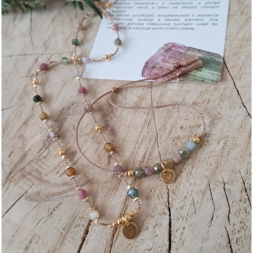 Náhrdelník a náramek s Melounovým turmalínem a pozlacenými korálky ze stříbra Ag925 na béžové šňůrce z hedvábí. Náhrdelník i náramek jsou doplněny placičkou, z chirurgické oceli (v odstínu "Gold").